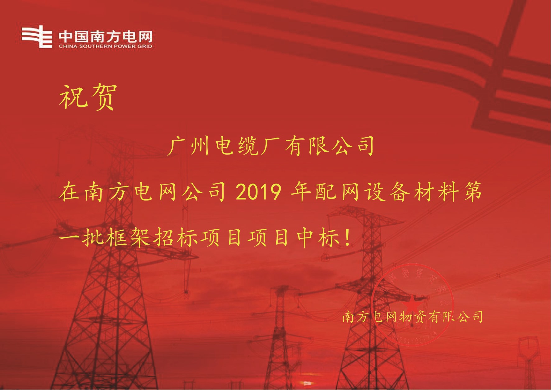 广州电缆公司在《南方电网公司2019年配网设备材料第一批框架招标项目》取得中标,中标金额为2.86亿元。