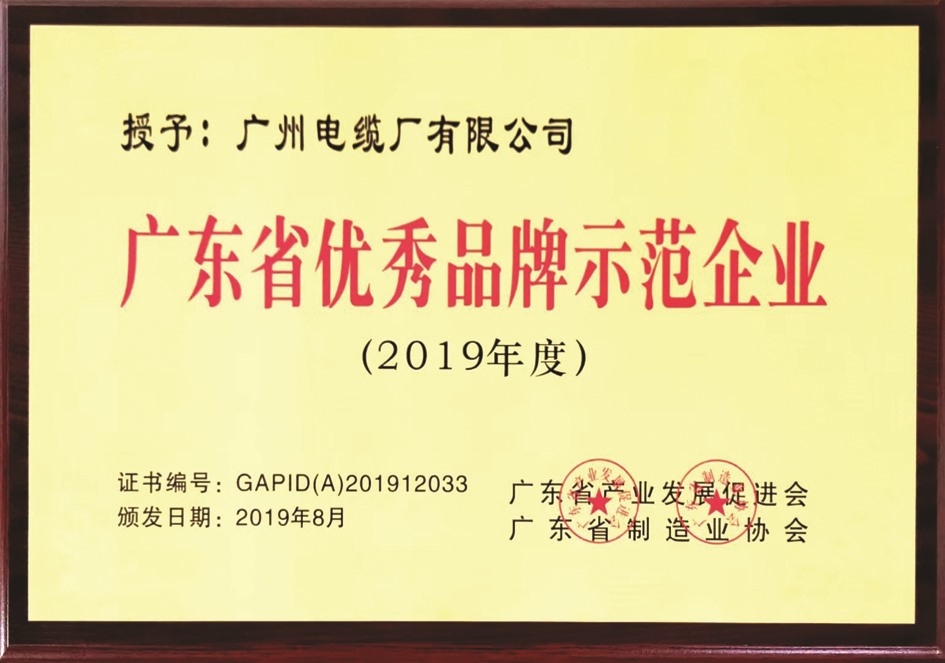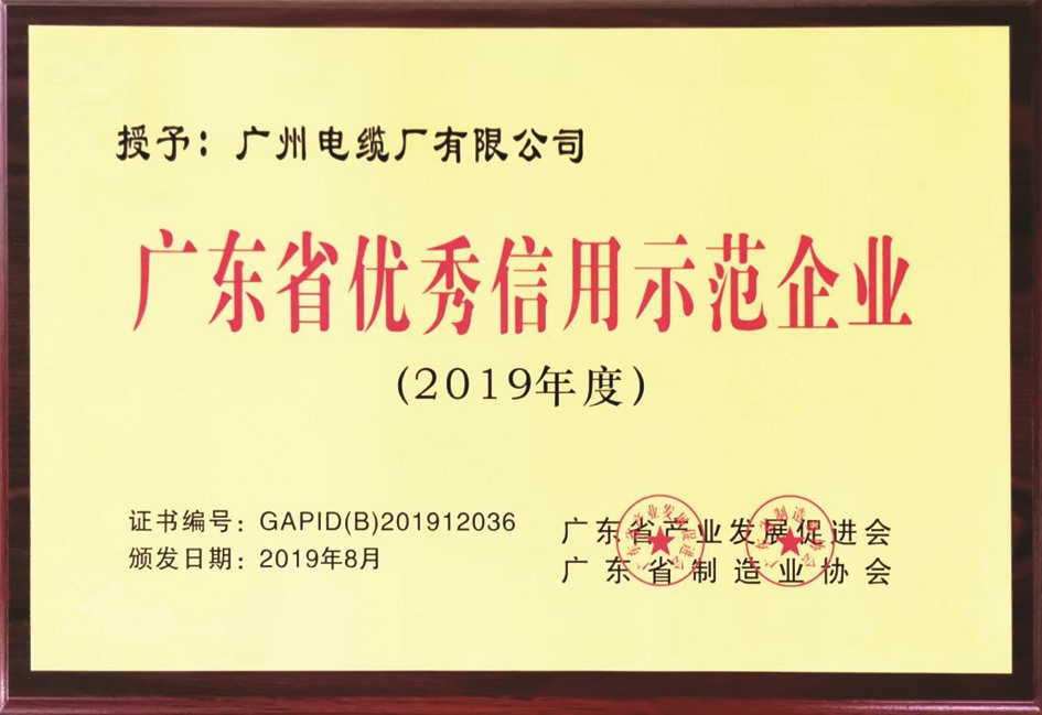 2019年8月,广州电缆公司凭借自身实力荣获广东省产业发展促进会、广东省制造业协会颁发的“2019年度广东省优秀信用示范企业”、“2019年度广东省优秀品牌示范企业”称号。
