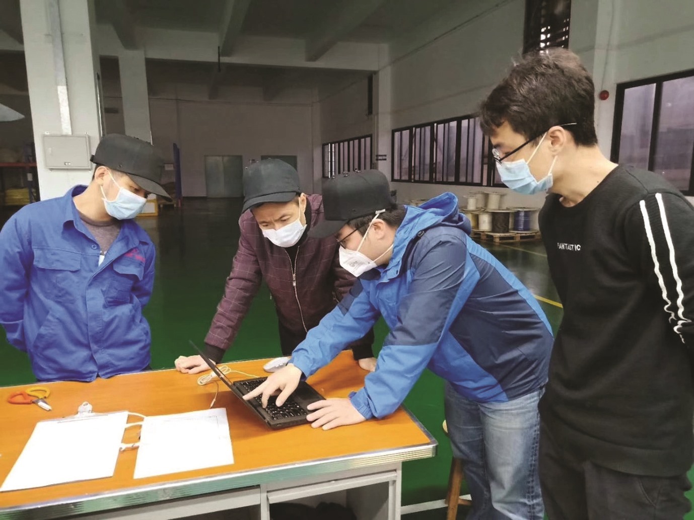 2月14日在广州市工信局的协调帮助下,工作组抵达口罩生产客户生产现场,与客户对接并充分了解了产品设计标准、基本检测标准、模具等需求后,立即筹划生产方案,筹备对铁丝放线架等现有生产设备进行改造和加工,当天晚上突破了铁线转卷轴的第一个生产瓶颈。