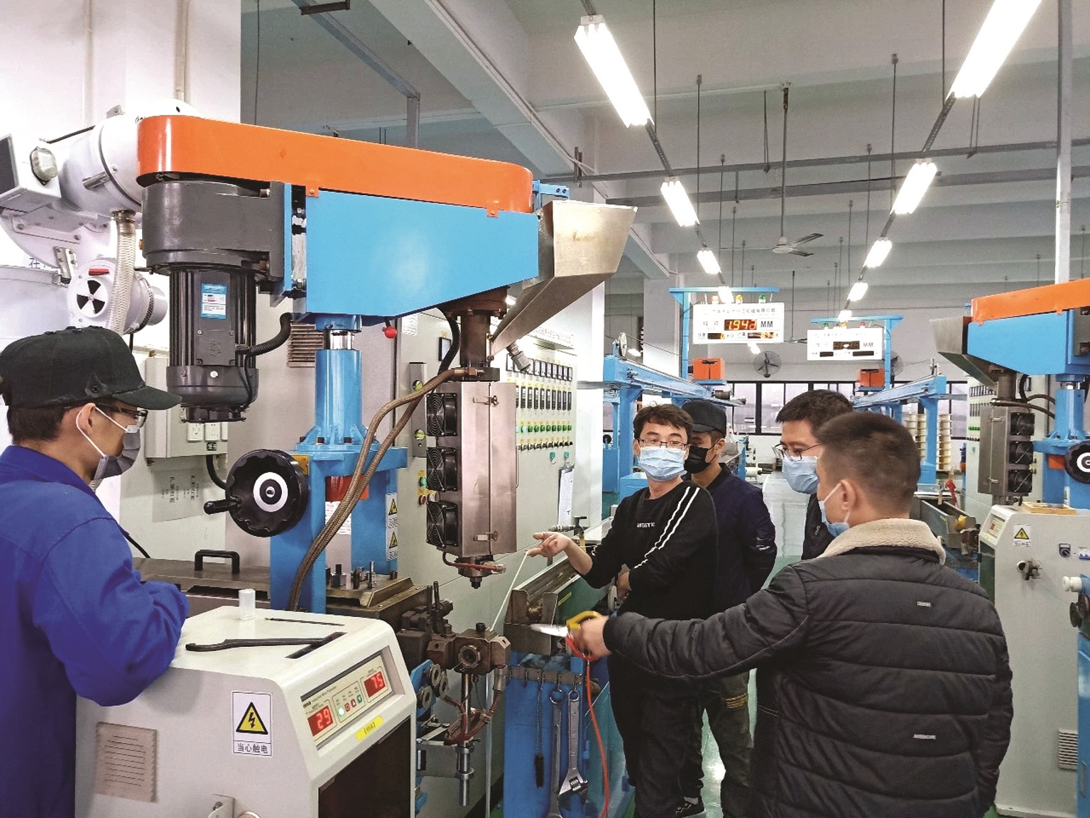3天达量产能力后,广州电缆员工日以继夜、加班加点,克服各种困难提升产能,与口罩生产厂家一起满足人民群众对口罩的迫切需要。市场上一般厂家能生产的是单筋扎装(5000米以下)鼻梁条,而广州电缆不满足于此,更与客户定制研发了适合更高速生产口罩用的盘装大长度(10000米以上)鼻梁条,大幅度减少客户停机切换生产口罩的时间,与疫情赛跑。两周以来,公司一手抓防疫一手抓生产,依靠广大员工辛劳与智慧,众志成城克服了鼻梁条所需盘装镀锌铁丝材料短缺、铁丝转卷轴效率低(设备改良9次)、铁丝焊接难、塑料挤出机不足挤出速度提升慢等行业共同难题,使鼻梁条实际产量从起初的10多公里/日达到目前近1100多公里/日,短短两周提升了100多倍。