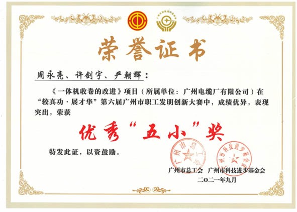 2021年9月,周永亮、许剑宇、严朝辉共同研发一体机收卷的改进装置,在第六届广州市职工发明创新大赛中,成绩优异,表现突出,获优秀“五小”奖。