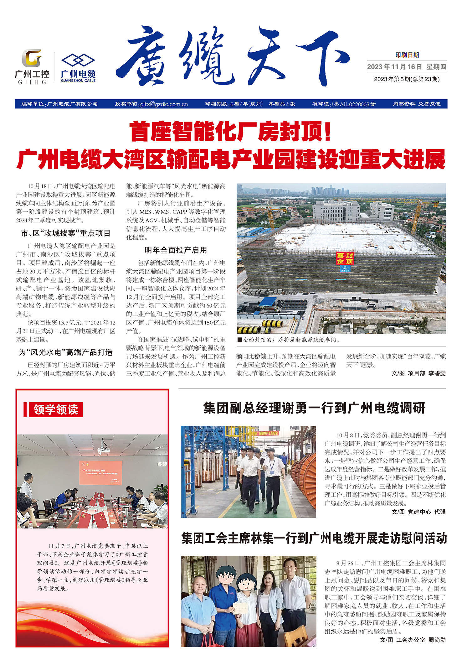 广缆天下广缆要闻 首座智能化厂房封顶!广州电缆大湾区输配电产业园建设迎重大进展 领学领读 集团副总经理谢勇一行到广州电缆调研 集团工会主席林集一行到广州电缆开展走访慰问活动