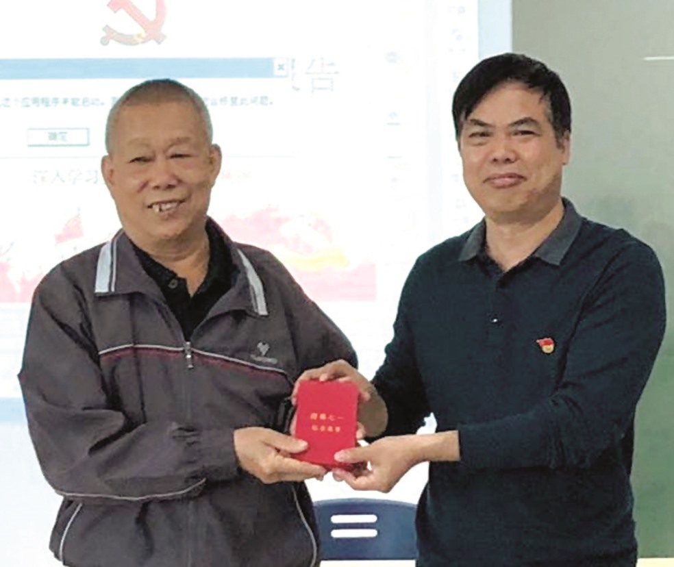 党委副书记严朝立同志在会上分享了学习感受,同时也提出了新时期党员的新要求,最后,向入党满50周年的老同志颁发“七一”南粤奖章。