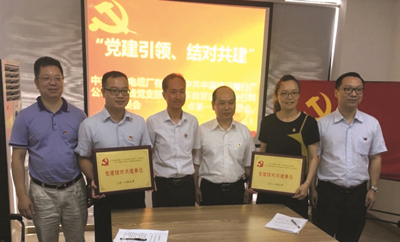 为推进“两学一做”学习教育常态化、制度化,进一步探索创新党建工作。2018年9月18日,广州电缆厂有限公司采财线支部与建行广东自贸试验区分行网点第一支部举行结对共建签约的仪式。由公司党委书记余群光同志和建行广东自贸区分行党委书记黄彤晖同志见证。银企共赢,通过座谈交流、重温入党誓词、签署党建共建协议书,开展“党建引领、结对共建”的党建共建活动。