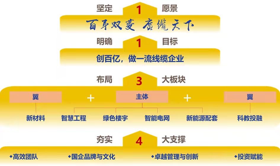 战略研讨会2021年11月24日启动,2022年1月9日实现战略输出。在此期间,公司充分发挥民主管理优势,聚集领导班子、中层以上干部、各部门业务骨干智慧,集思广益,擘画未来,对标市场,结合广州工控“十四五”战略规划,将公司“十四五”规划打磨成符合公司实际、更具广缆特色、方向目标明确的“1134”战略规划,即夯实高效团队、国企品牌与文化、卓越管理与创新、投资赋能4大支撑;布局以智慧工程、绿色楼宇、智能电网、新能源配套为主体,新材料、科教投融为两翼的3大板块;明确“创200亿营收,做一流线缆企业”目标;坚定“百年双菱、广缆天下”愿景。