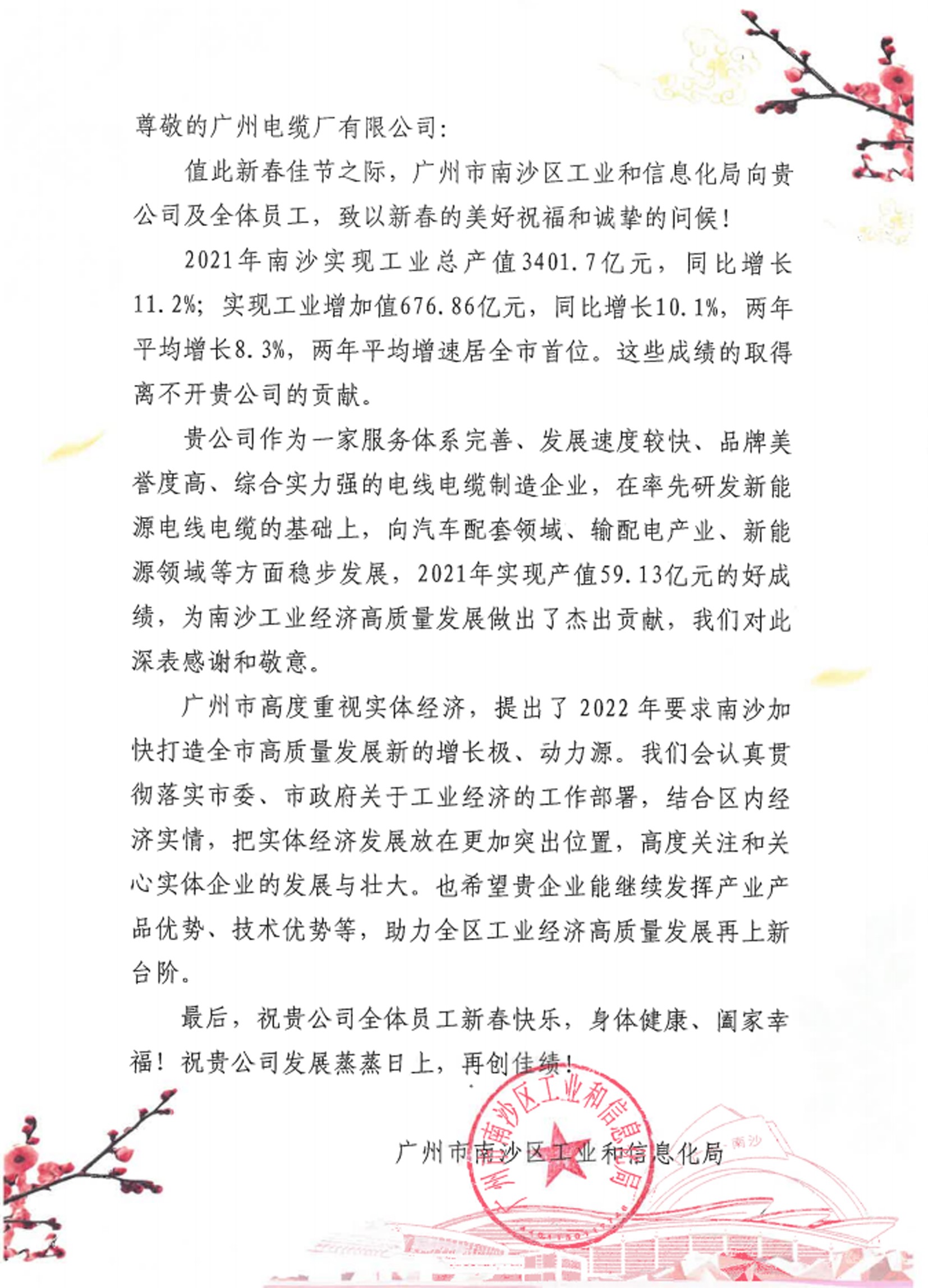 1月,公司收到广州市南沙区工业和信息化局感谢信,对公司参与推动南沙区工业经济高质量发展表示感谢。