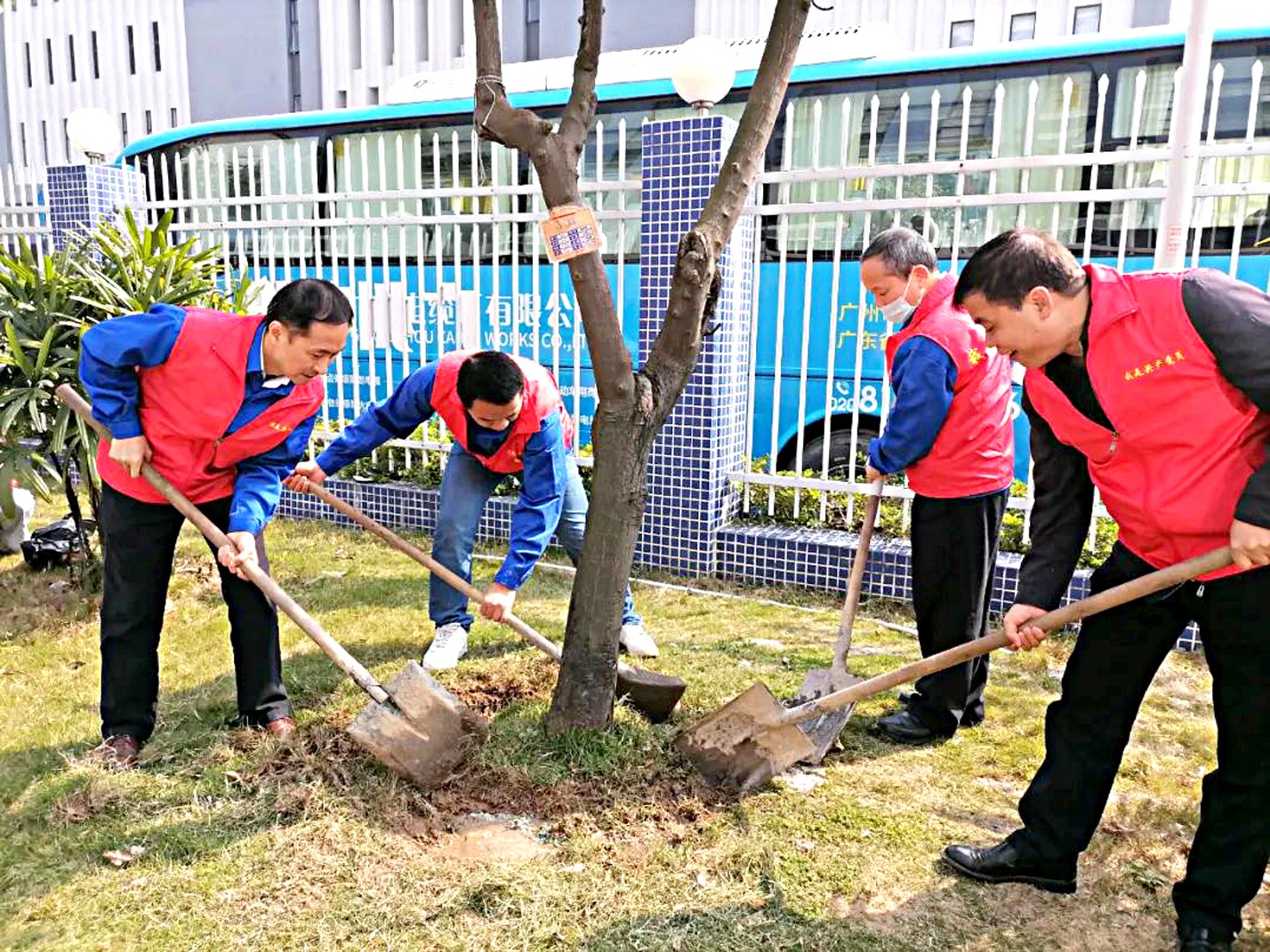在公司团委书记宣布活动任务,强调活动纪律和活动意义后,身穿红马甲的志愿者们分为3个队伍,为厂区进行“爱绿护绿”行动。有的拿剪刀,有的拿铁锨,迅速投入“战斗”。扬锨铲土、放肥料、回填、浇水、除草、为草坪立上文明标语牌,你搭把手,我帮下忙,默契配合,干劲十足。