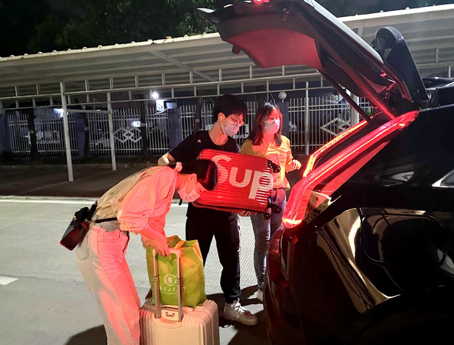 ▲食材无法进入管控区,后勤人员在管控边界接力装载食材回公司