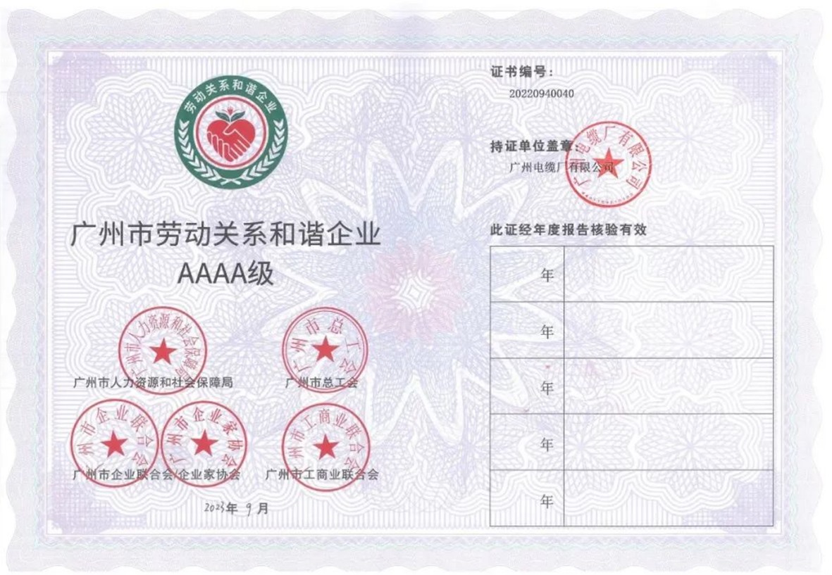 近日,公司获得由广州市人力资源和社会保障局、广州市总工会等多个部门共同授予的“广州市劳动关系和谐企业AAAA级”荣誉称号。