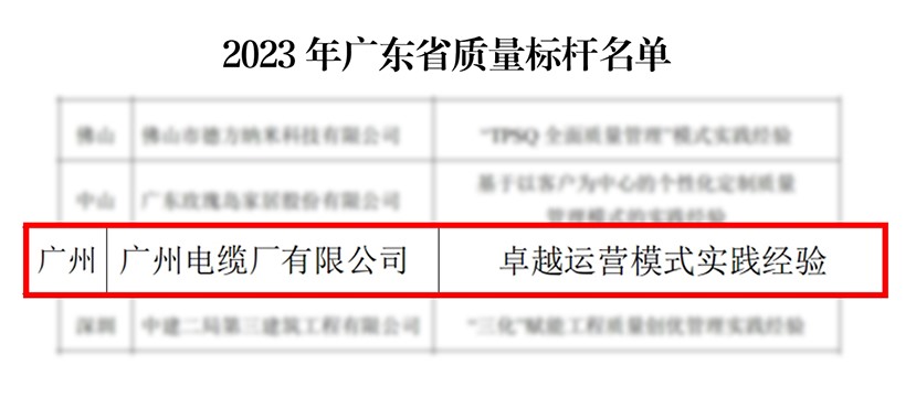 近日,广东省质量协会公布“2023年广东省质量标杆”名单,广州电缆凭借“卓越运营模式实践经验”成功入选,成为广东省唯一获此殊荣的电线电缆企业。