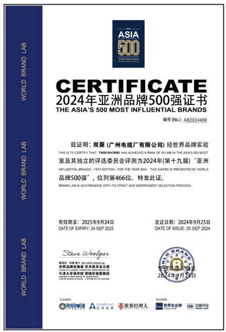 由世界品牌实验室主办的“亚洲品牌大会”于9月25日在中国香港召开。广州电缆荣获“亚洲品牌500强”称号,位列第466位,是唯一入选该榜单的电线电缆企业,与丰田、国家电网、华为、腾讯、中国移动等20个国家和地区的500个品牌共同登榜,彰显强大的品牌实力。