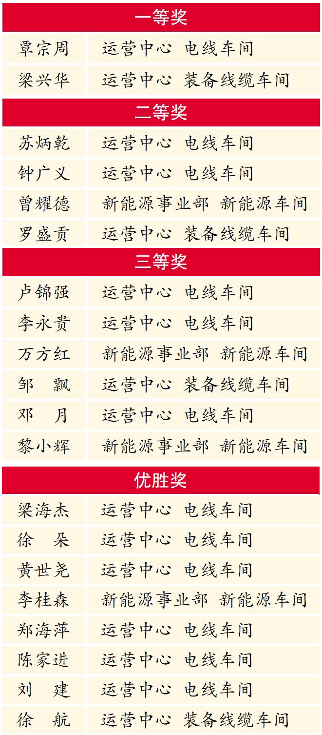 近日,公司2024年“广缆杯”电线电缆制造工(挤塑工)劳动技能竞赛圆满结束。来自各车间的20名选手脱颖而出,摘得竞赛荣誉。这是广州电缆以赛促干砺精兵,大力推进产业工人队伍建设,推动企业高质量发展的重要举措。 赞0
