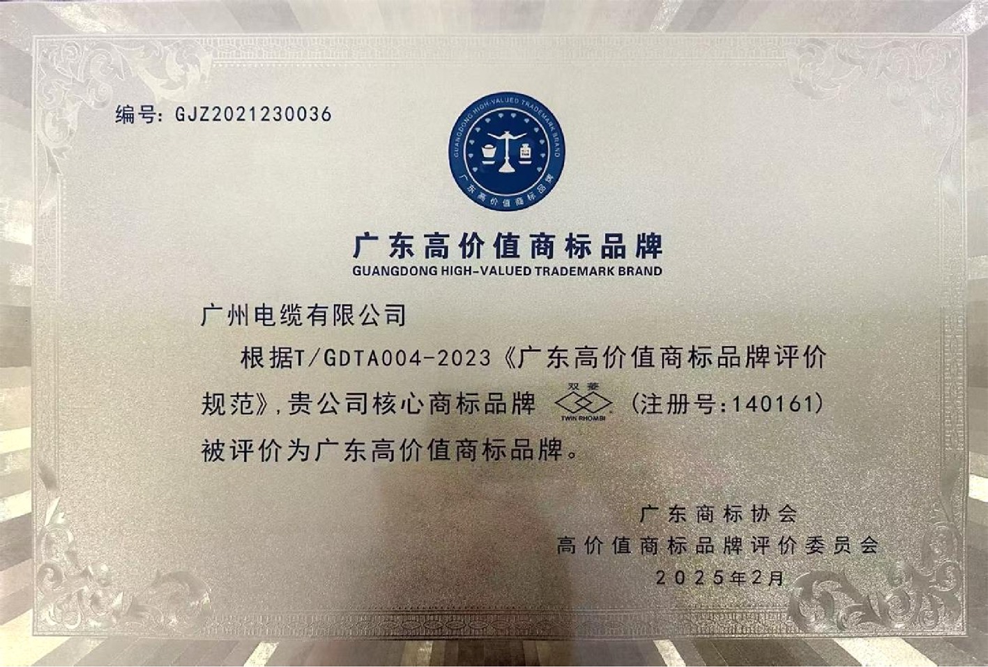 2月28日,2025广东高价值商标品牌榜单隆重发布,广州电缆凭借雄厚的综合实力和不断跃升的品牌价值获评首批"广东高价值商标品牌"称号。
