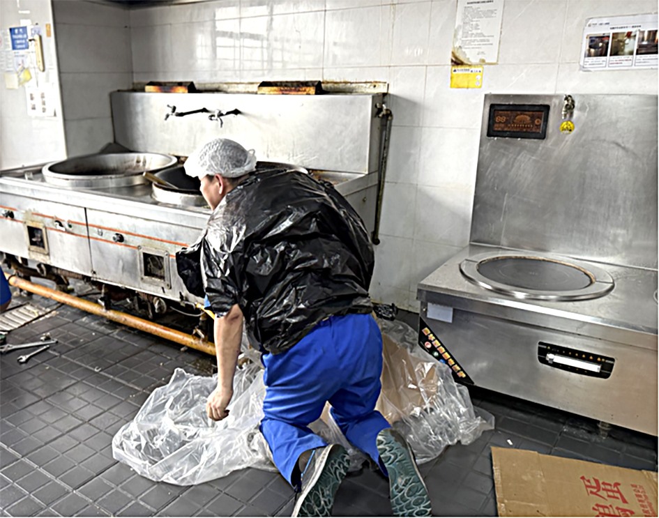 6月5日,饭堂炒锅底部水龙头接口因老化突然爆裂,持续漏水影响正常供餐。技改动力同事黎超雄第一时间赶到现场,面对灶台周边密布天然气管道的复杂环境,常规维修需拆卸灶台并由专业燃气公司处理,流程繁琐且耗时数日。为保障职工用餐,他果断创新应急方案:利用垃圾袋自制简易防脏衣,俯身钻入狭窄灶台底部,在有限空间内精准完成水龙头接口更换。此操作不仅节省专业维修费用,更避免因拆卸灶台导致的燃气停供风险,为正常供餐争取时间。